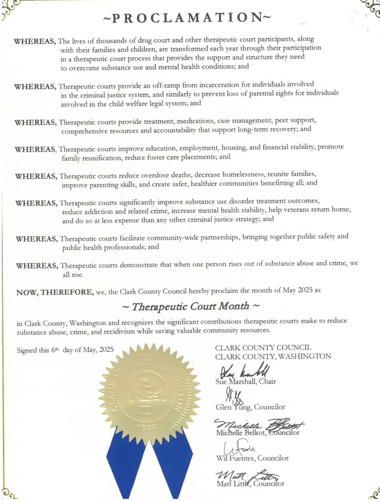 Click here to watch as Judge Bartlett accepts the proclamation that was signed by all Council members of Clark County declaring May 2025 as Therapeutic Court Month.