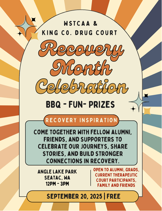 The WSTCAA & King County Drug Court are inviting you to an upcoming in-person Recovery Month celebration happening on September 20th at Angle Lake Park in SeaTac, WA. The BBQ and celebration is open to all